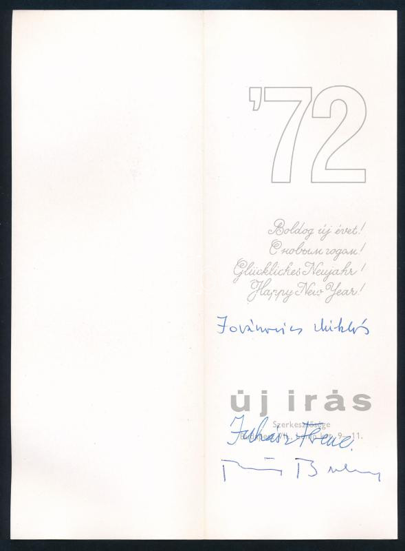 1972 Juhász Ferenc, Jovanovics Miklós, ... írók aláírása új írás c. lap üdvözlőlapján