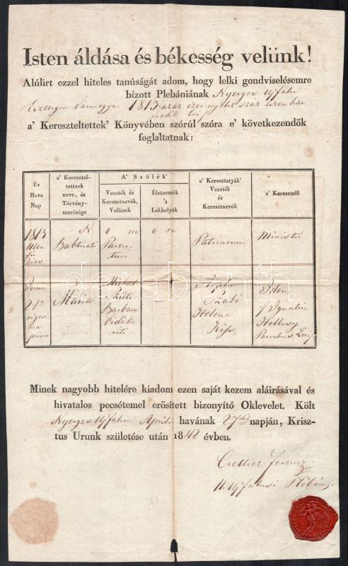 https://www.darabanth.com/en/437-Online-auction/437.0/Art-and-other-collectibles/Documents~500020/1842-Nyergesujfalu-anyakonyvi-kivonat-Crettier-Ferenc-plebanos-alairasaval-viaszpecsette~II2846733