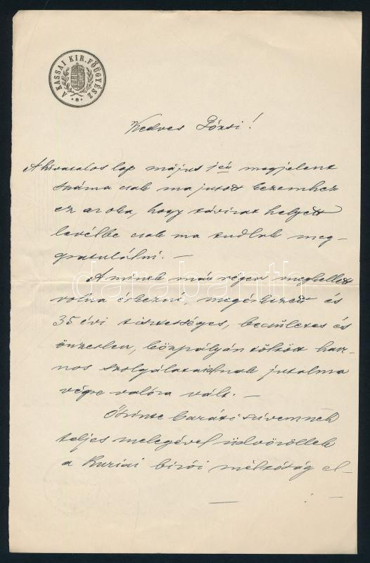 1914 Kassai főügyész, Kurovszky Ferenc saját kézzel írt levele