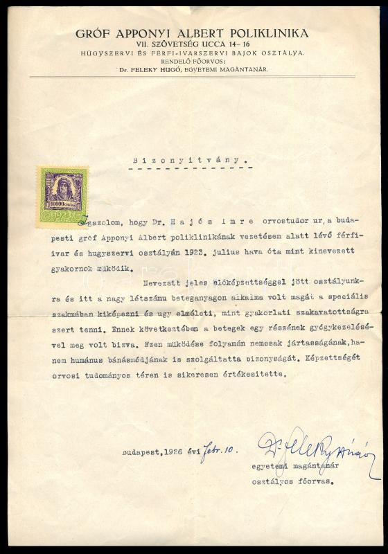 Description: 1926 Bp., Gróf Apponyi Albert Poliklinika húgyszervi és férfi-ivarszervi bajok osztályának főorvosa által kiállított igazolás (bizonyítvány) gyakornok részére, aláírással, 10.000 K okmánybélyeggel