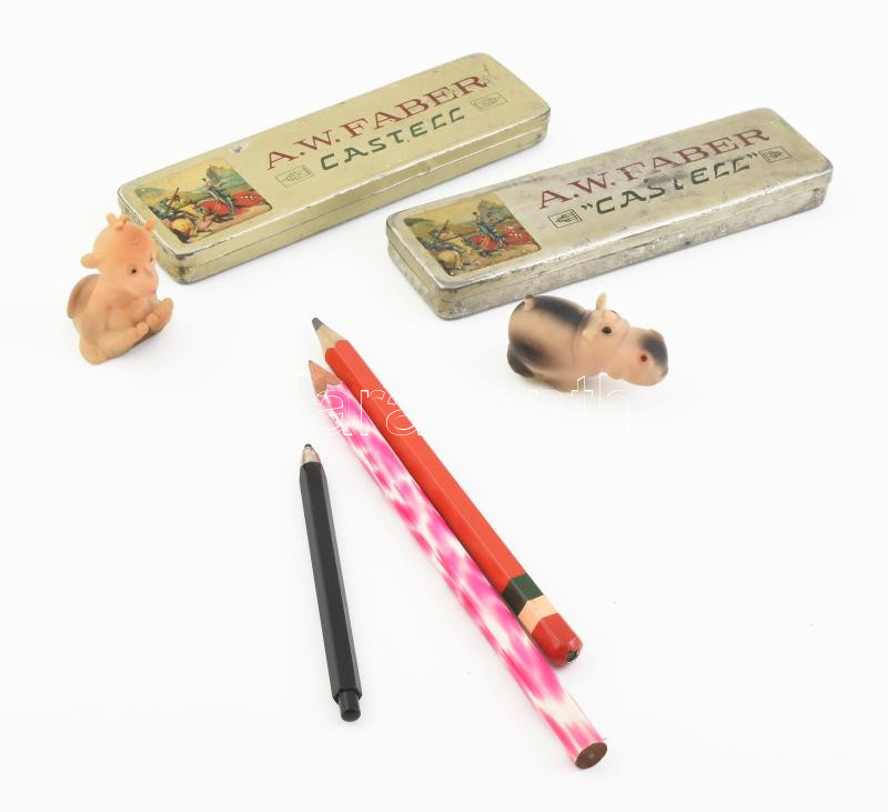 Description: Írószer tétel: 2 db Faber-Castell fém doboz, 2 db grafithegy doboz (az egyik tartalommal), 2 db nagy ceruza, egy töltőceruza, 2 db állatfigurás hegyező