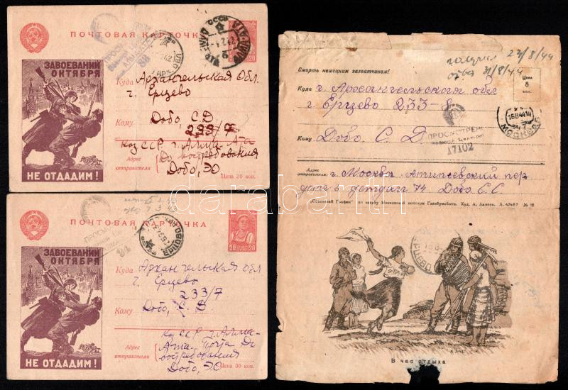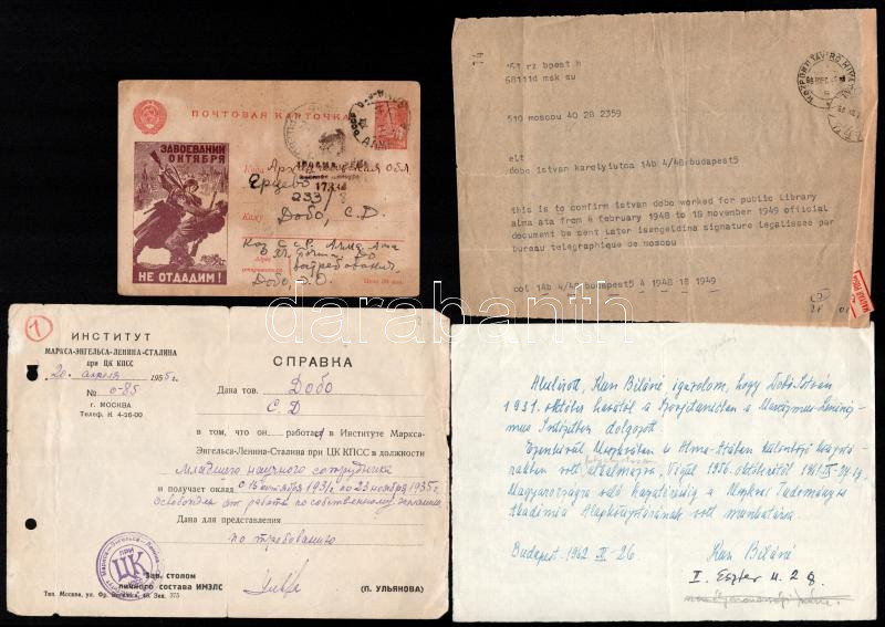1962 Bp., Kun Béláné (Gál Irén, szül. Grün) (1890-1974) autográf kézirata, igazolás Dobó István részére arról, hogy 1931. októbertől a moszkvai Marxizmus-Leninizmus Intézetben, majd Moszkvában és Alma-Atában (Almati, Kazahsztán) különböző könyvtáraknál dolgozott, végül 1956-tól a Moszkvai Tudományos Akadémia munkatársa volt. Kun Béláné aláírásával (1926 és 1937 között ő maga is Moszkvában, a Marx-Engels-Lenin Intézetben dolgozott; Magyarországra 1959-ben tért vissza). + 6 db további kapcsolódó irat: a moszkvai Marx-Engels-Lenin-Sztálin Intézet orosz nyelvű, ill. az Alma-atai Könyvtár angol nyelvű igazolása, valamint négy orosz nyelven megírt levelezőlap, mind Dobó István részére címezve