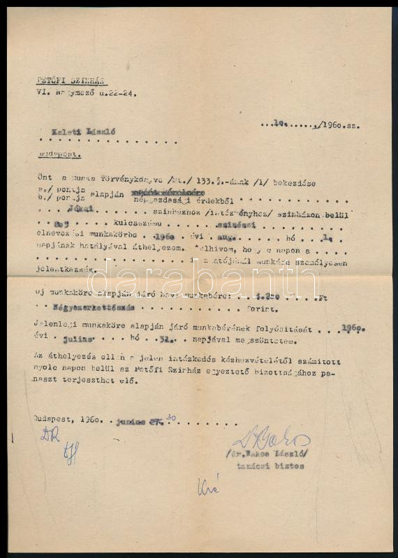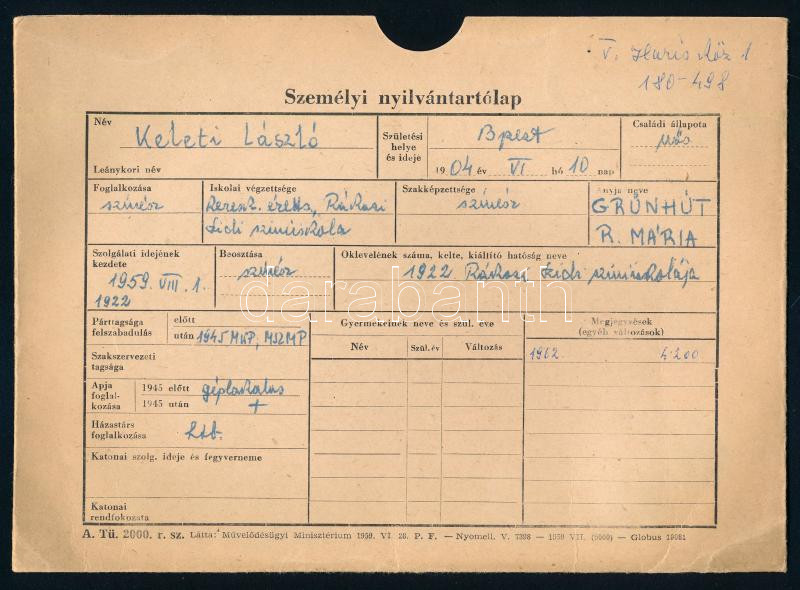 cca 1960 Keleti László (1904-1972) színművész személyi nyilvántartó lapja, valamint önéletrajza