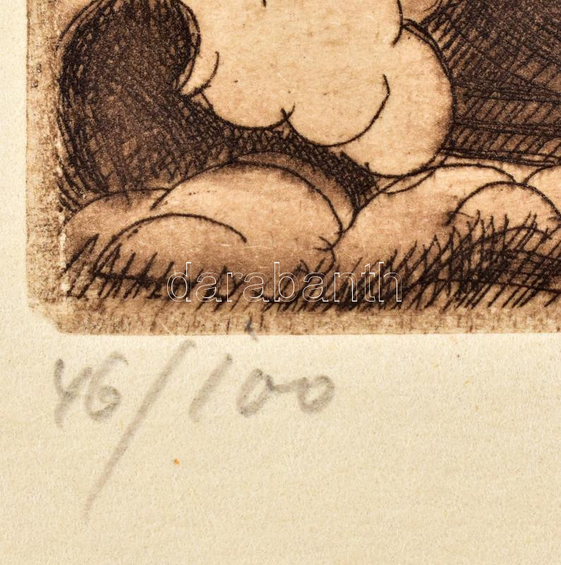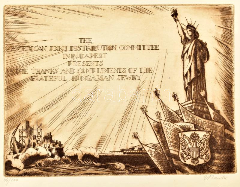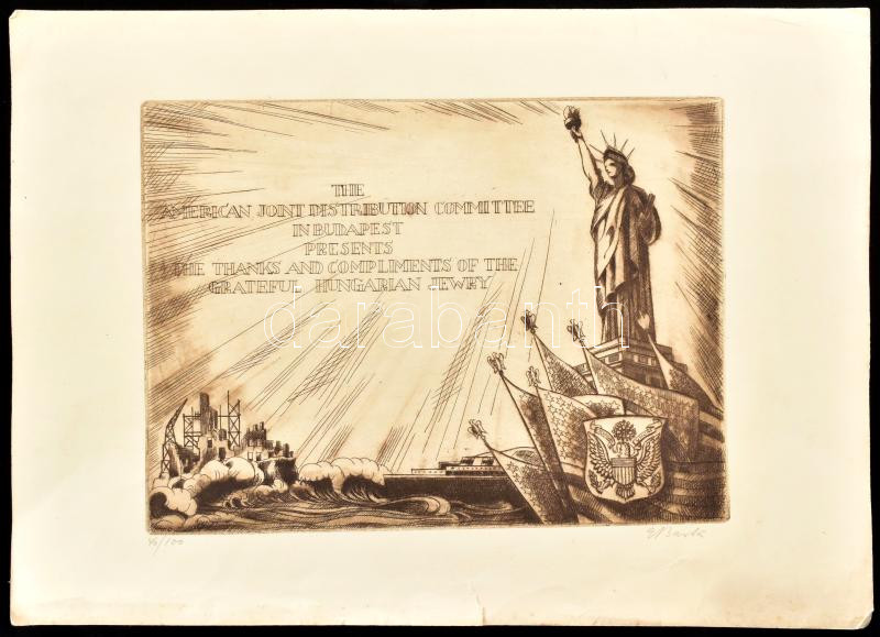 Description: Barta Ernő (1878-1956): A budapesti zsidók szövetségének köszönő oklevele. sorszámozott rézkarc, 45/100. Jelzett Kép méret: 24x17 cm Szélén, képet nem érintő beszakadással