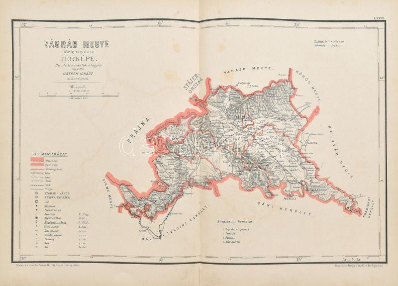 1880 Hátsek Ignác (1827-1902): Zágráb megye közigazgatási térképe, rajta Zágráb, Sziszek, Károlyváros..stb., 1:500.000, Bp., Rautmann Frigyes,(Posner Károly Lajos-ny.), egy-két egészen kis folttal, 30x47 cm