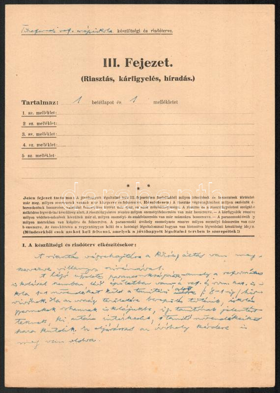 Description: 1943 Tiszafüredi Ref. Népiskola készüétségi és riadóterve, légoltalmi iratok a II. világháború idejéből, 11 db fejezetből álló, eredeti kiadói mappában.