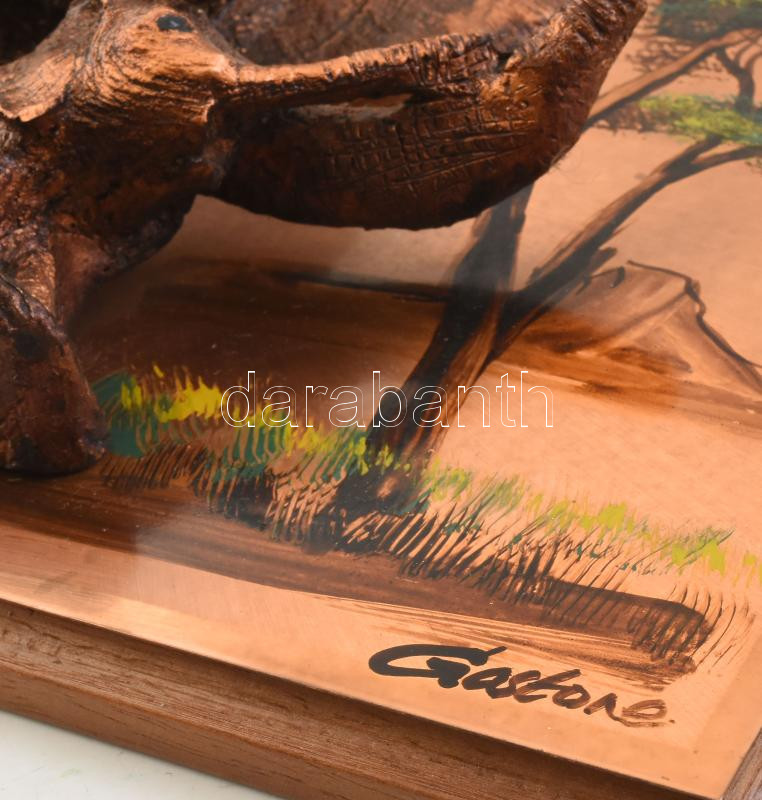 Gaston jelzéssel: Elefántok. Kézzel festett réz lap, műgyanta dombormű...