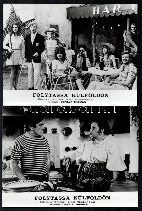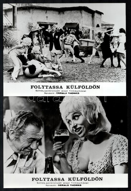Description: cca 1972 ,,Folytassa külföldön" című angol filmbohózat jelenetei és szereplői, 9 db vintage produkciós filmfotó, ezüst zselatinos fotópapíron, a használatból eredő (esetleges) kisebb hibákkal, 18x24 cm