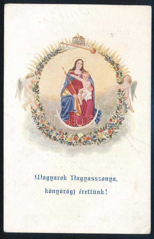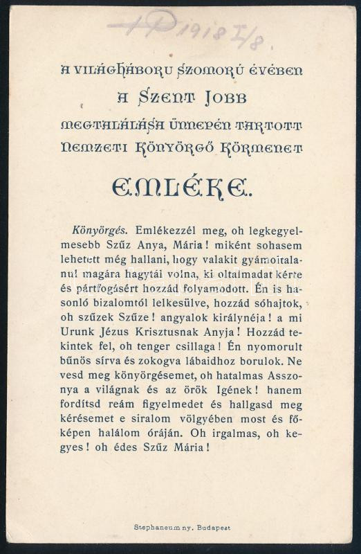 Description: 1915 "A világháború szomorú évében a Szent Jobb megtalálása ünnepén tartott nemzeti könyörgő körmenet emléke", színes, Szűz Mária-ábrázolással illusztrált emléklap, szentkép. Bp., Stephaneum-ny., 14x9 cm