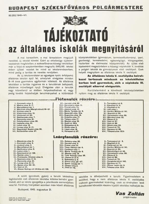 1945 Tájékoztató az általános iskolák megnyitásáról nagy méretű hirdet...