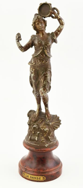 Francia, hidegen festett spiáter táncosnő,kezében tamburin és castagnette "La Danse" felirattal a fa talpon(fa repedt), részletgazdag öntvény. Kopásokkal