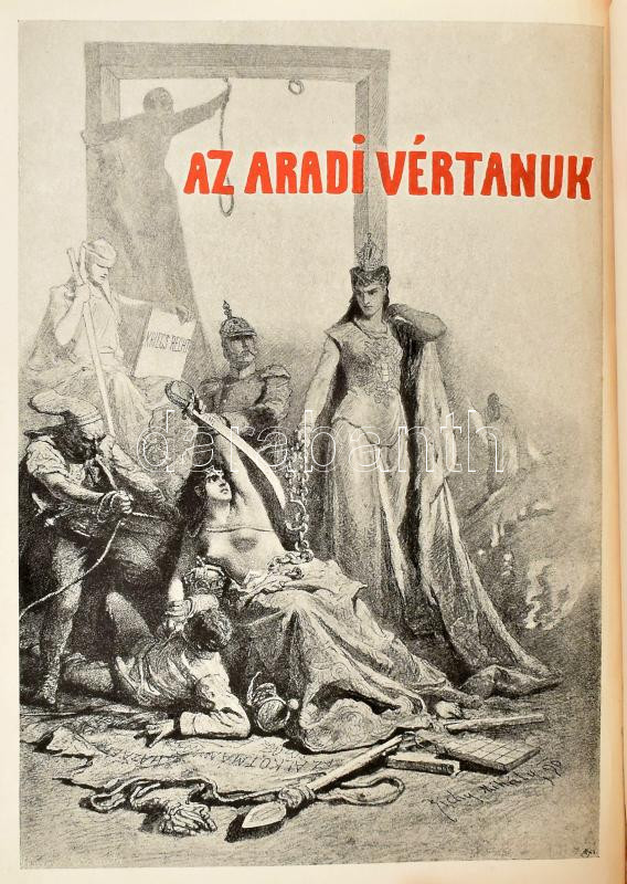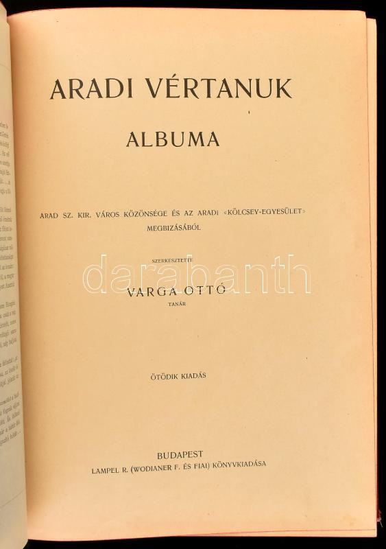 Aradi vértanúk albuma. Arad sz. kir. város közönsége és az aradi "Kölcsey-Egyesület" megbÃzásából szerkesztette Varga Ottó. Bp.,(1902), Lampel R. (Wodianer F. és Fiai),1 t.(dÃszcÃmlap)+297+3 p.+7 (hasonmás)+1 t. Ötödik kiadás. Kiadói aranyozott, festett egészvászon-kötés, Leszik-kötés, festett lapélekkel, kopott borÃtóval, javÃtott gerinccel.