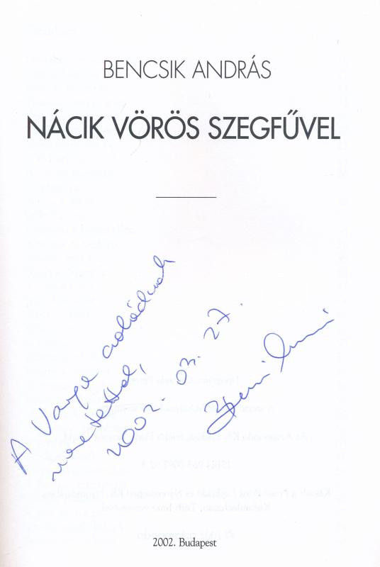 https://www.darabanth.com/en/437-Online-auction/437.0/Books/Books-History~1000014/Bencsik-Andras-Nacik-voros-szegfuvel-DEDIKALT-Bp-2002-Artamondo-Kft-Kiadoi-papirkot~II2850578