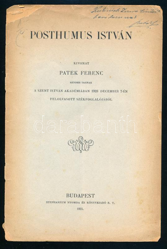Patek Ferenc: Posthumus István. A szerző, Patek Ferenc, (1889-1937) ál... https://www.darabanth.com/en/437-Online-auction/437.0/Books/Books-History~1000014/Patek-Ferenc-Posthumus-Istvan-A-szerzo-Patek-Ferenc-1889-1937-altal-Lukinich-Imre-1880-195~II2849247