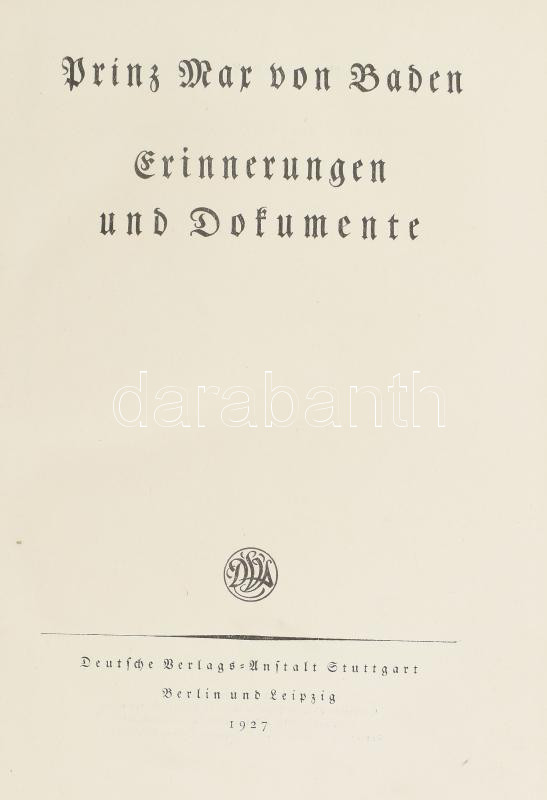 Prinz Max von Baden: Erinnerungen und Dokumente. Berlin und Leipzig, 1... https://www.darabanth.com/en/437-Online-auction/437.0/Books/Books-History~1000014/Prinz-Max-von-Baden-Erinnerungen-und-Dokumente-Berlin-und-Leipzig-1927-DVA-Nemet-nyelven-ElsC5~II2807810