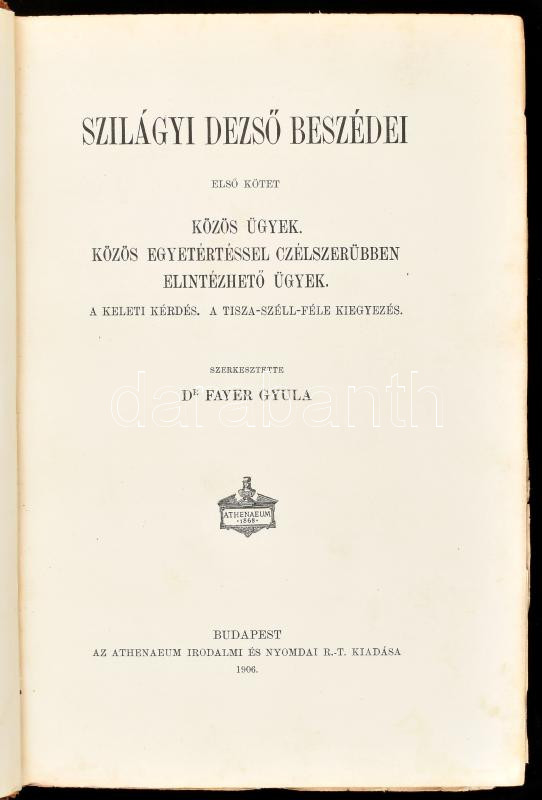 Description: Szilágyi Dezső beszédei. I. köt.: Közös ügyek. Közös egyetértéssel célszerűbben elintézhető ügyek. A keleti kérdés. A Tisza-Széll-féle kiegyezés. Szerk.: Fayer Gyula. Bp., 1906, Athenaeum, 1 t.+ XX+428 p. Aranyozott, bordázott gerincű félbőr-kötésben, helyenként kissé sérült lapszélekkel.