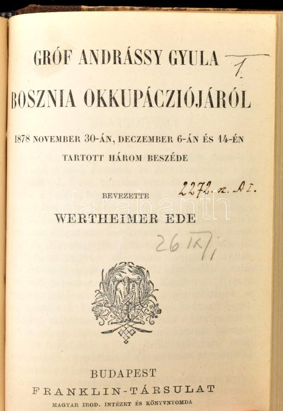 Gróf Andrássy Gyula Bosznia okkupácziójáról. 1878 november 30-án, deczember 6-án és 14-én tartott három beszéde. Wertheimer Ede bevezetőjével. Bp., 1880-1916., Franklin,47+1; 77; 117; 18; 247+1; 60; 132 p. Átkötött kissé kopott félvászon-kötésben.