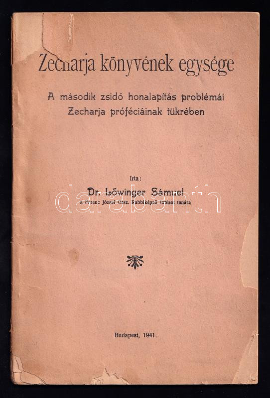 Lőwinger Sámuel: Zecharja könyvének egysége. A második zsidó honalapítás problémái Zecharja prófáciáinak tükrében. Bp., 1941. 52p. Kiadói papírkötésben, sérüléssel