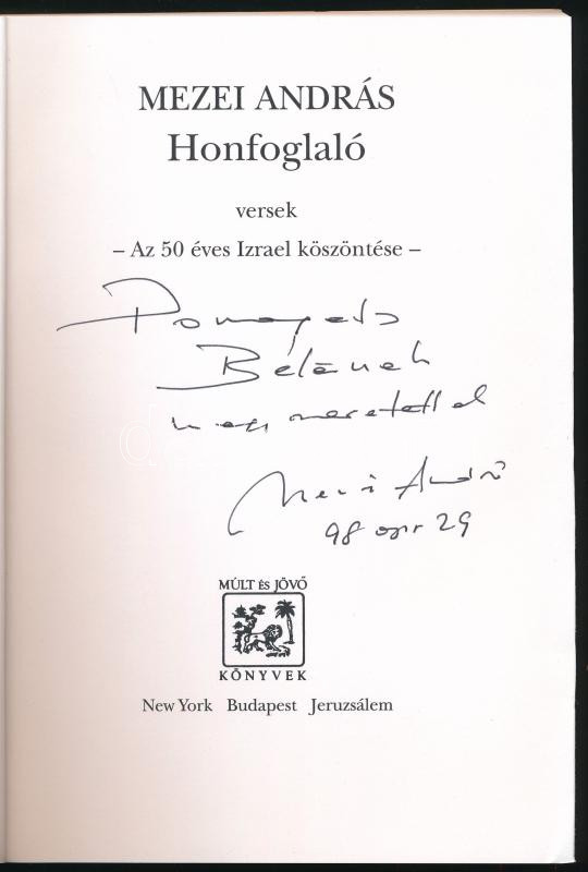 Mezei András: Honfoglaló. Versek. Az 50 éves Izrael köszöntése. New Yo... https://www.darabanth.com/en/437-Online-auction/437.0/Books/Books-Judaica~1000025/Mezei-Andras-Honfoglalo-Versek-Az-50-eves-Izrael-koszontese-New-York-Bp-Jeruzsalem-1998~II2843906