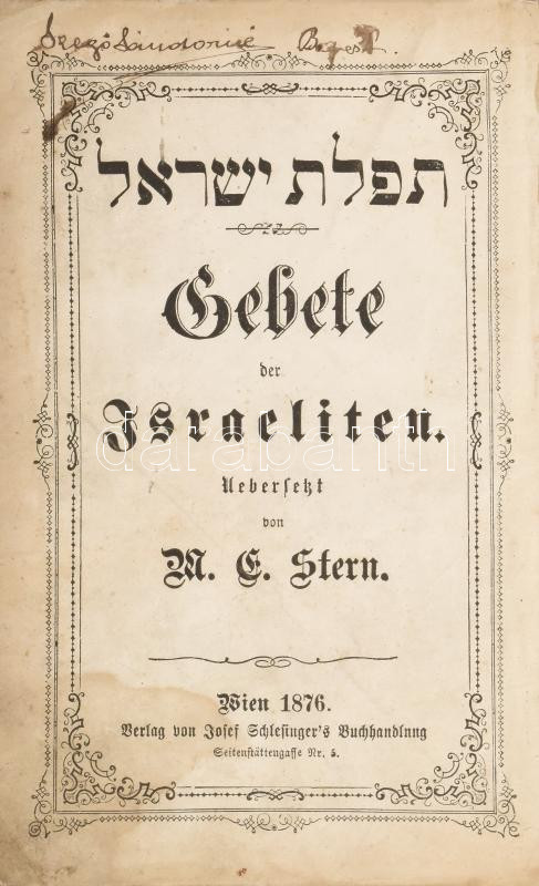 Stern, [Max Emanuel]: Gebete der Israeliten. [Izraelita imakönyv]. Wie... https://www.darabanth.com/en/437-Online-auction/437.0/Books/Books-Judaica~1000025/Stern-Max-Emanuel-Gebete-der-Israeliten-Izraelita-imakonyv-Wien-1876-Josef-Schlesinger-H~II2842094