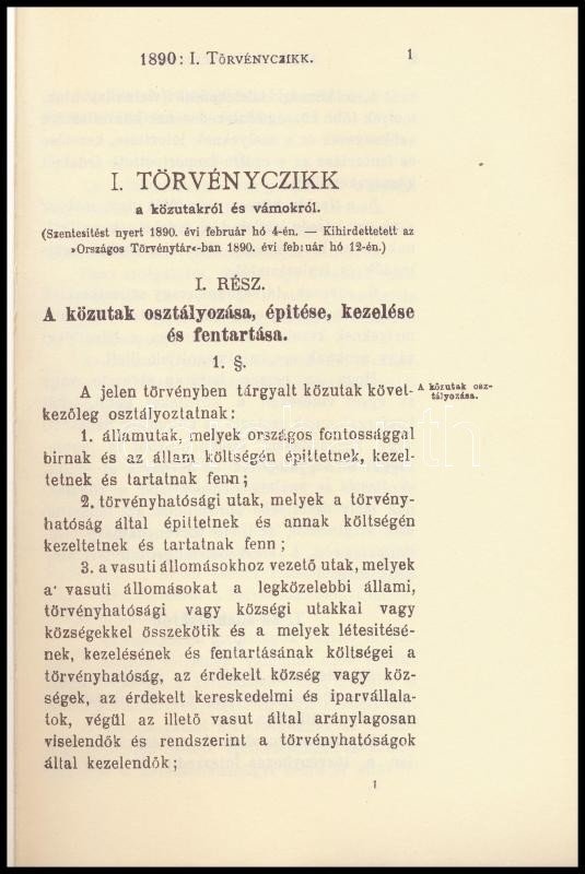 A közutakról és vámokról szóló 1890. évi I. törv.-czikk kiadás reprint...