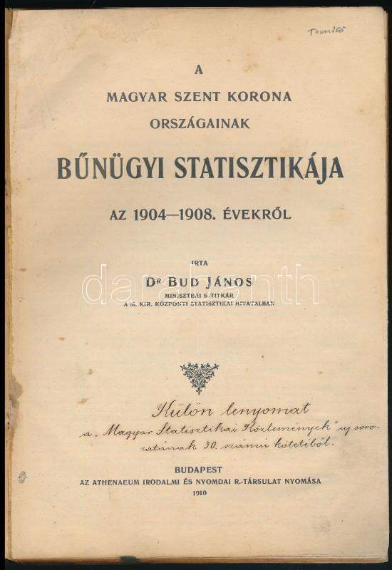 Bud János: A Magyar Szent Korona Országainak bűnügyi statisztikája az ... https://www.darabanth.com/en/437-Online-auction/437.0/Books/Books-Law~1000013/Bud-Janos-A-Magyar-Szent-Korona-Orszagainak-bunugyi-statisztikaja-az-1904-1908-evekrol-Bp~II2837507