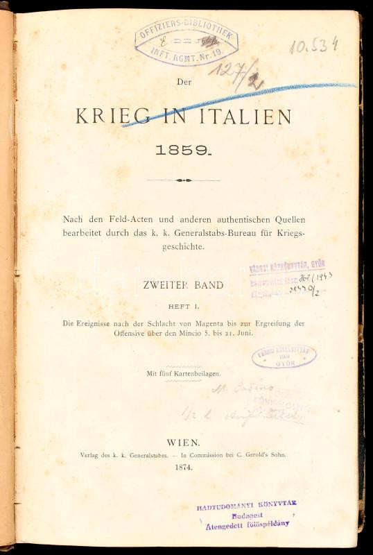 Bécs, 1872-1876, Verl. des k.k. Generalstabes (Gerold's Sohn). Német nyelven. Térkép mellékletek nélkül. Aranyozott gerincű félvászon kötésben, márványozott lapélekkel, kissé sérült gerinccel és borítóval, intézményi bélyegzőkkel, kissé foltos lapokkal, néhány kevés lapon ceruzás és tollas jelöléssel.