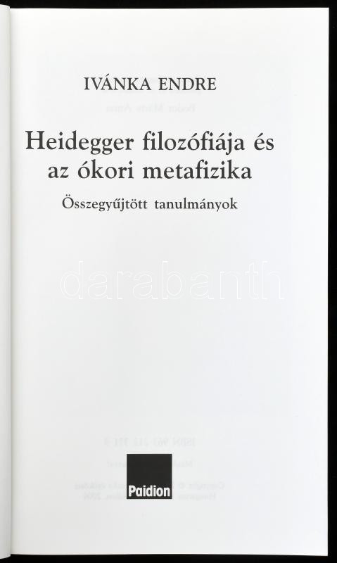 Ivánka Endre: Heidegger filozófiája és az ókori metafizika. Összegyűjtött tanulmányok. Bp., 2004, Paidion. Kiadói papírkötés, jó állapotban.