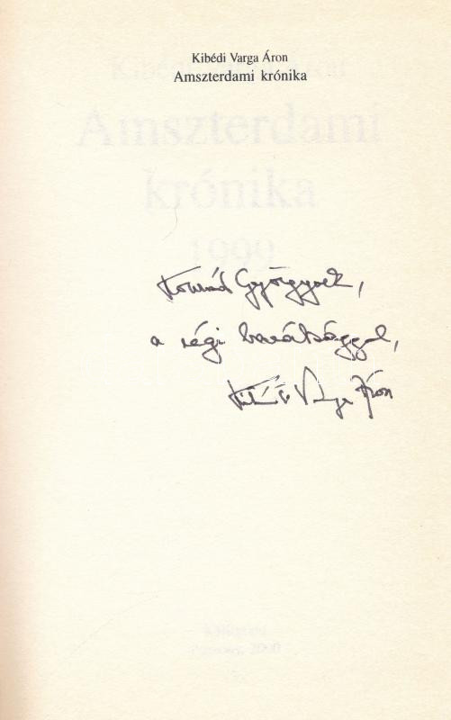 Description: Kibédi Varga Áron: Amszterdami krónika 1999. Pozsony, 2000, Kalligram. Első kiadás. Kiadói kartonált papírkötés. A szerző által Konrád György (1933-2019) Kossuth-díjas író részére DEDIKÁLT példány.