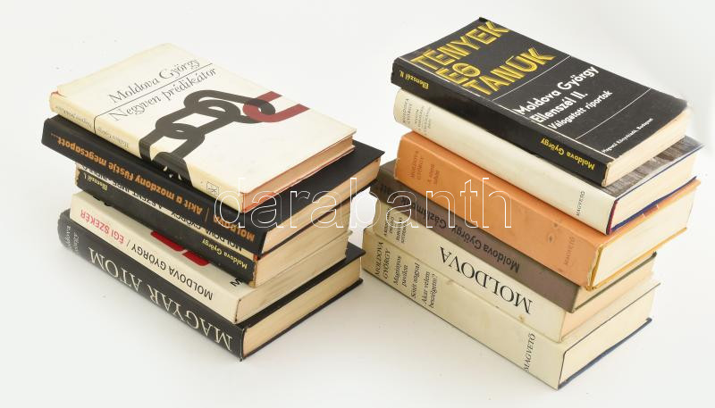 Moldova György 11 db DEDIKÁLT kötete: Ellenszél I.-II. (első kötet dedikált); Magyar atom; Égi szekér, A szent tehén; Magányos pavilon, Sötét angyal, Akar velem beszélgetni (három mű egy kötetben); A Szent-Imre induló; A Szent-Imre induló, Elhúzódó szüzesség (két mű egy kötetben); Gázlámpák alatt; Akit a mozdony füstje megcsapott; Negyven prédikátor; Malom a pokolban, A változások őrei (két mű egy kötetben). Klf. kiadások és kötések, vegyes állapotban.