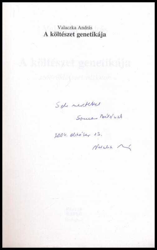 Valaczka András: A költészet genetikája. Szóörökléstani vázlatok. A sz... https://www.darabanth.com/en/437-Online-auction/437.0/Books/Books-Other-rarities~1000030/Valaczka-Andras-A-kolteszet-genetikaja-Szooroklestani-vazlatok-A-szerzo-altal-Somos-BC3~II2773021