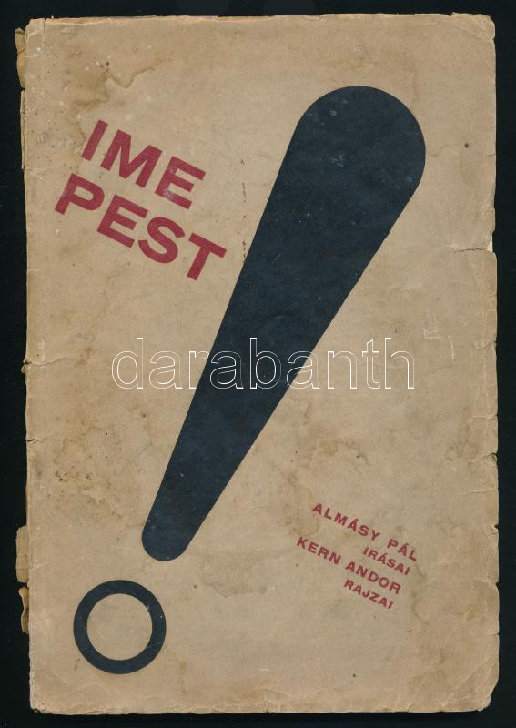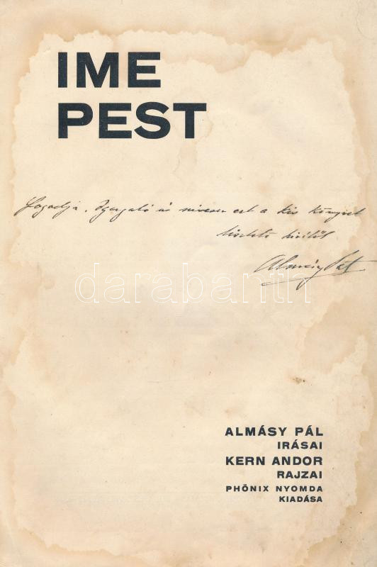 Almásy Pál: Ime Pest! Kern Andor rajzaival. DEDIKÁLT! Bp.,(1932.), Phőnix, 79 p. Kiadói papírkötés, sérült borítóval, foltos, rossz állapotban.
