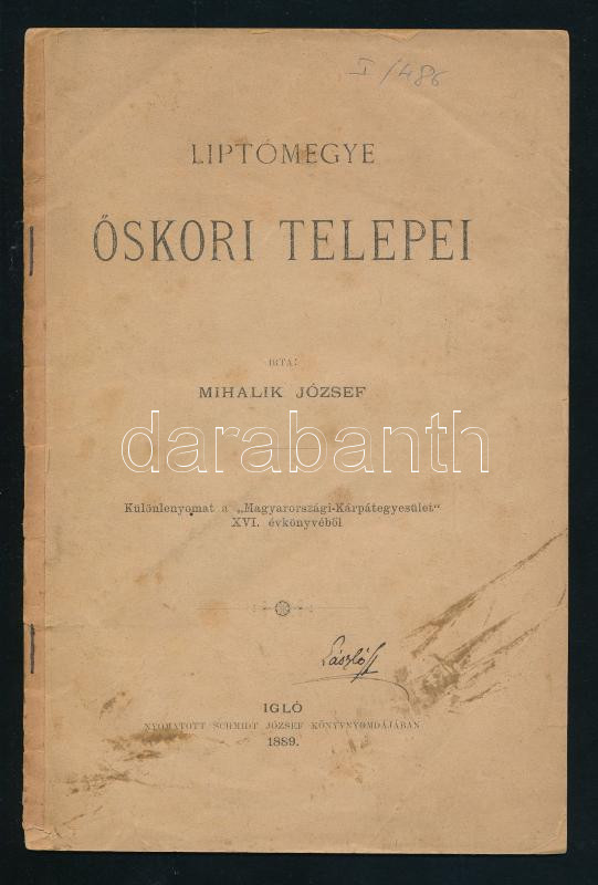 Mihalik József: Liptómegye őskori telepei. Igló, 1889., Schmidt-ny., 30 p. Különlenyomat. Papírkötés, foltos, sz utolsó két lap szakadt.