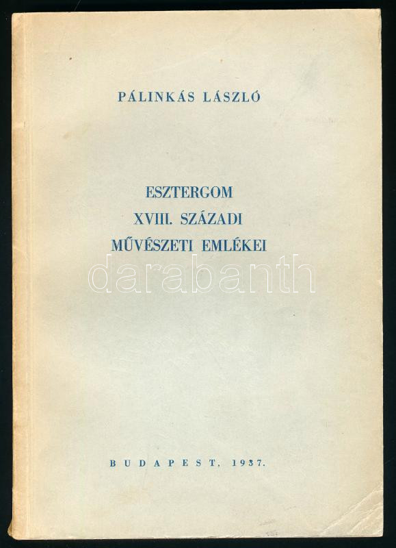 Pálinkás László: Esztergom XVIII. századi művészeti emlékei. Bp., 1937, (May János-ny.), 95+(1) p. + 9 t. (kétoldalas). Fekete-fehér képekkel illusztrálva. Kiadói papírkötés, a gerincen kis sérüléssel, két lap kijár. A szerző által DEDIKÁLT példány!