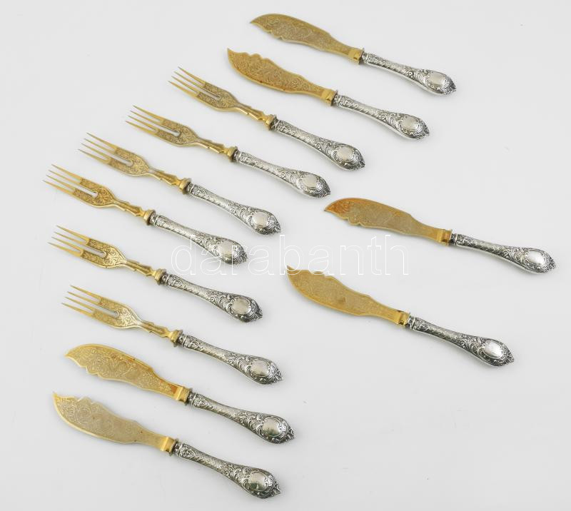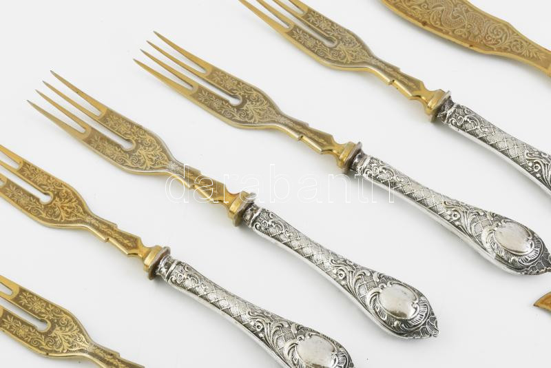 Ezüst (Ag) nyelű, aranyozott süteményes villa és kés készlet gazdagon ...