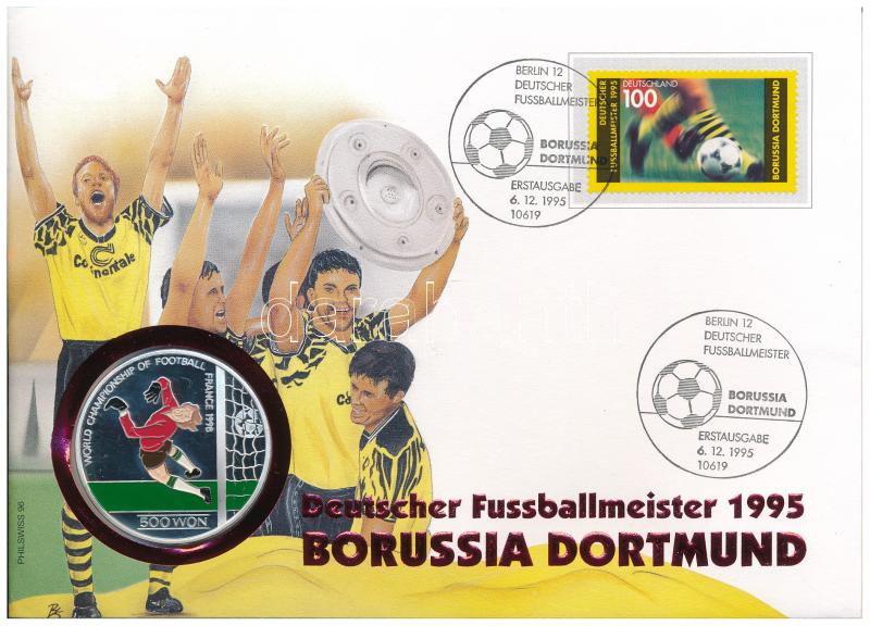Description: Észak-Korea 1996. 500W Ag "Labdarúgó Világbajnokság Franciaország 1998" részben multicolor emlékérme, "Borussia Dortmund" borítékban, bélyeggel, bélyegzéssel, német nyelvű leírással T:PP patina