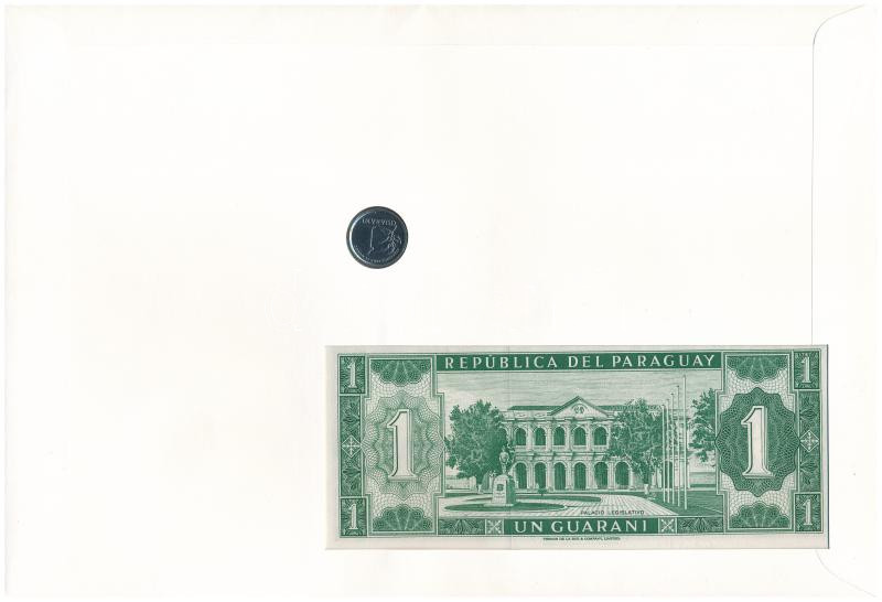 Paraguay 1984. 1G acél + 1952. 1G felbélyegzett "Chaco katona" érmés és bankjegyes borítékban alkalmi bélyegzéssel, német leírással T:UNC