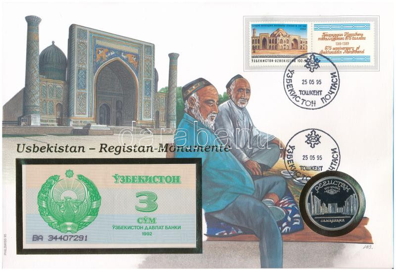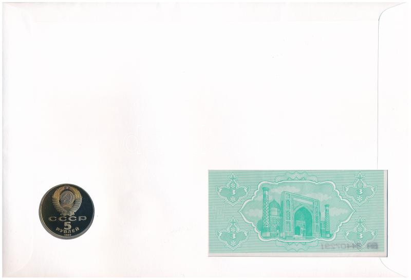 Description: Üzbegisztán érmés és bankjegyes, pecsételt boríték benne Szovjetunió 1989. 5R Cu-Ni "Samarkand" érmével és Üzbegisztán 1992. 3S-os bankjeggyel, német nyelvű leírással T:PP,UNC patina