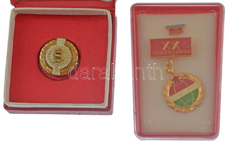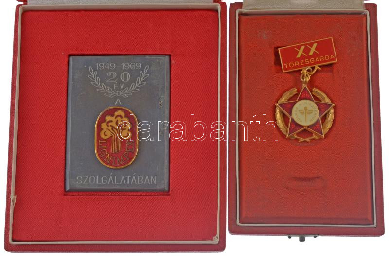 1969. "LIGNIMPEX" Zn emlékplakett zománcozott rátéttel, eredeti tokban, "Külkereskedelmi Törzsgárda" aranyozott műgyantás jelvénnyel és igazolással + ~1970. "XX. Törzsgárda - Külker. Minisztérium" aranyozott, műgyantás kitüntető jelvény miniatűrrel, eredeti tokban + ~1970. "Igazságügyi Törzsgárda - 10 év" festett, műgyantás jelvény, eredeti tokban (26mm) + ~1980. "XX Törzsgárda - Utasellátó" aranyozott, műgyantás kitüntető jelvény miniatűrrel, eredeti tokban T:UNC,AU