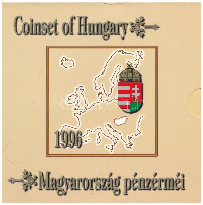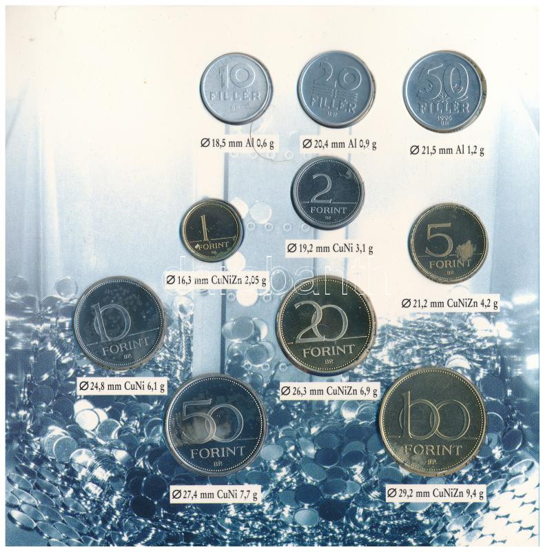 1996. 10f-100Ft 10klf db "50 éves a forint" forgalmi sor dísztokban. A tokon a ragasztás részben elengedett. A 100Ft-os érme BU kivitelben került be a forgalmi sorba! T:PP patina Adamo FO29.3