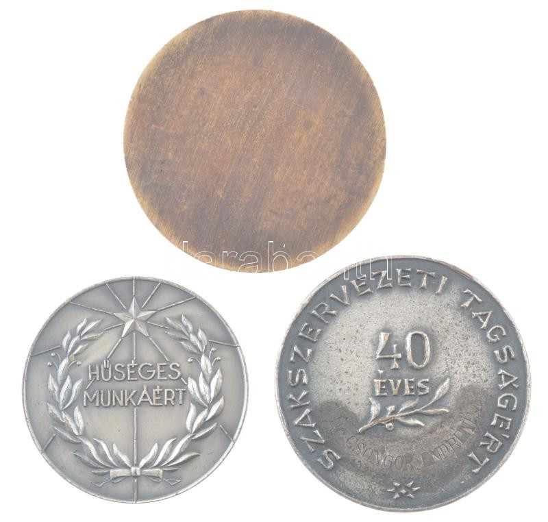 1970. "Száz éves a magyar baromfiipar" egyoldalas bronz plakett (72mm) + "Közalkalmazottak szakszervezete - 40 éves szakszervezeti tagságért" ezüstpatinázott bronz plakett (68mm) + "Hűséges munkáért / Kismotor- és Gépgyár" ezüstpatinázott bronz érem (61mm) T:1,1- közte koromlerakódás