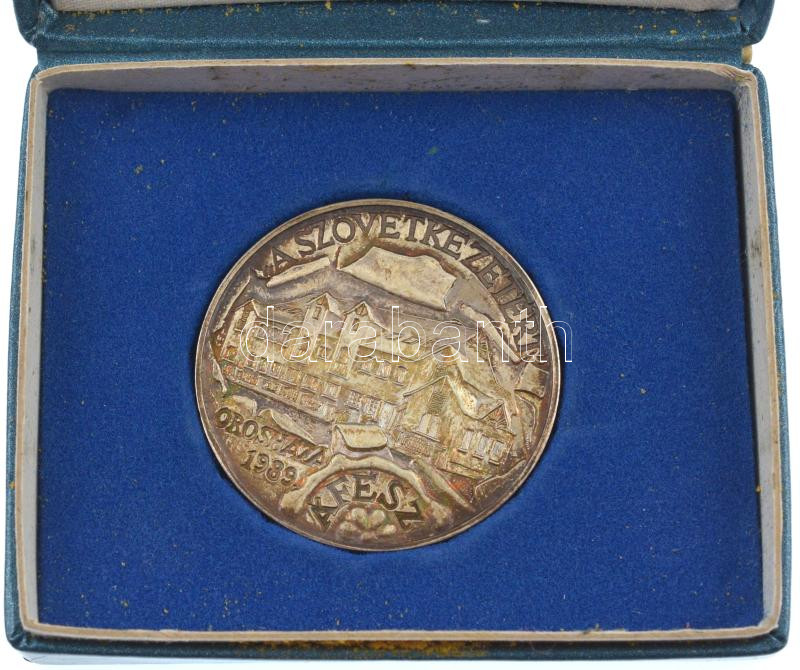 Rajki László (1939-) 1989. "A Szövetkezetért - Orosháza 1989 - ÁFÉSZ" kétoldalas, peremén jelzett Ag emlékérem dísztokban (35,5g/0.835/42,5mm) T:AU patina