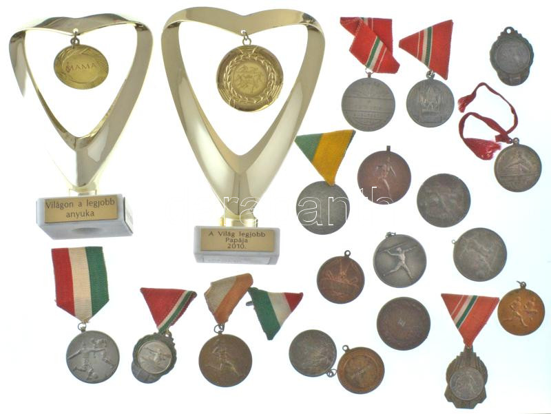 Description: 18db-os sport díjéremtétel + 2db műanyag díj műkő talapzaton, egyiken "A világ legjobb papája", másikon "Világon a legjobb anyuka / nagymama / dédi / feleség" feliratokkal T:vegyes
