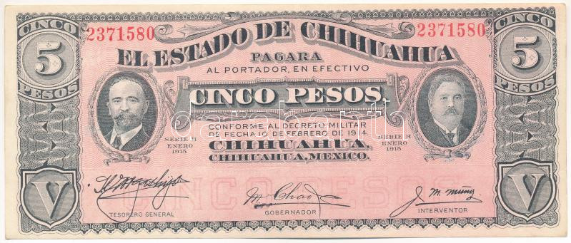 Mexikó / Forradalom / Chihuahua 1915. 5P hátoldalán fekte felülbélyegz...