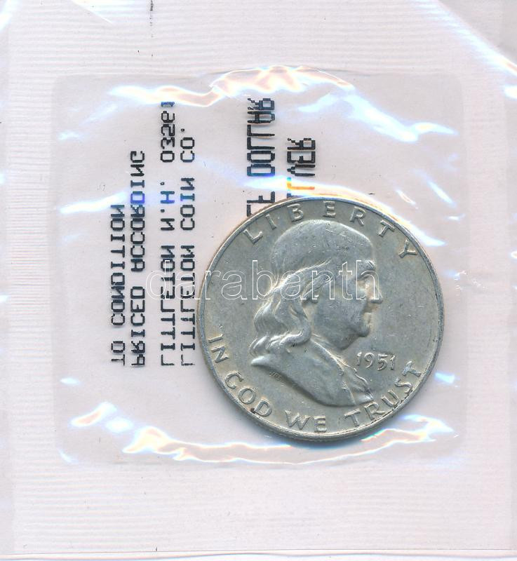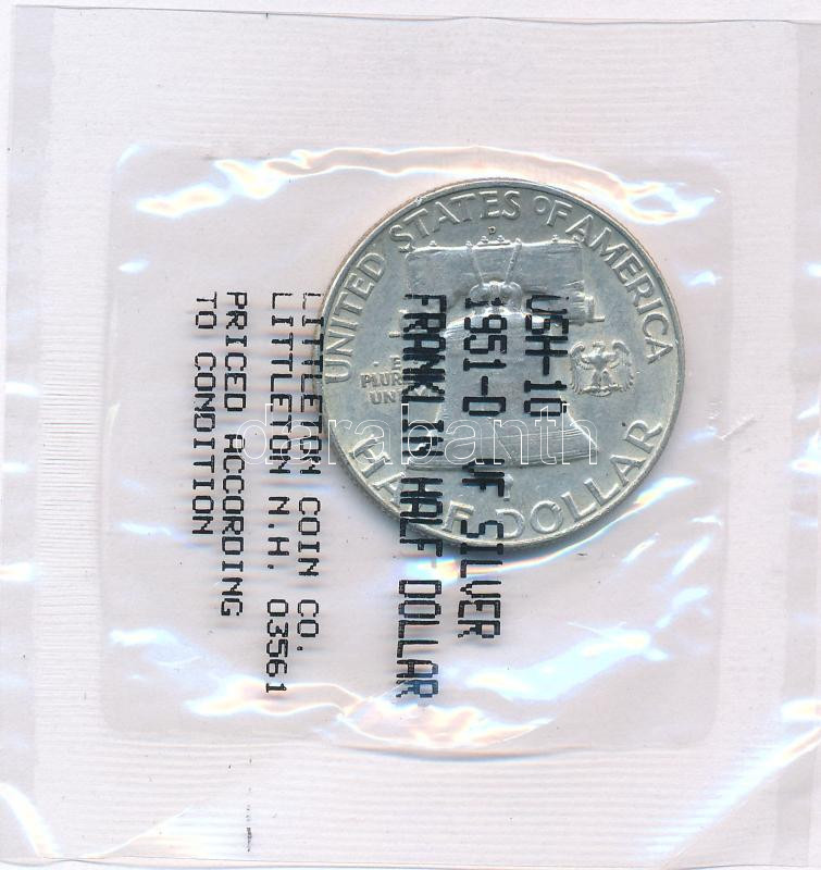 Amerikai Egyesült Államok 1951. 1/2$ Ag "Franklin" fóliacsom... https://www.darabanth.com/en/437-Online-auction/437.0/Numismatics/Worldwide-silver-and-metal-coins~2500001/Amerikai-Egyesult-Allamok-1951-12USD-Ag-Franklin-foliacsomagolasban-TVF-patina-USA-1951-12~II2844988