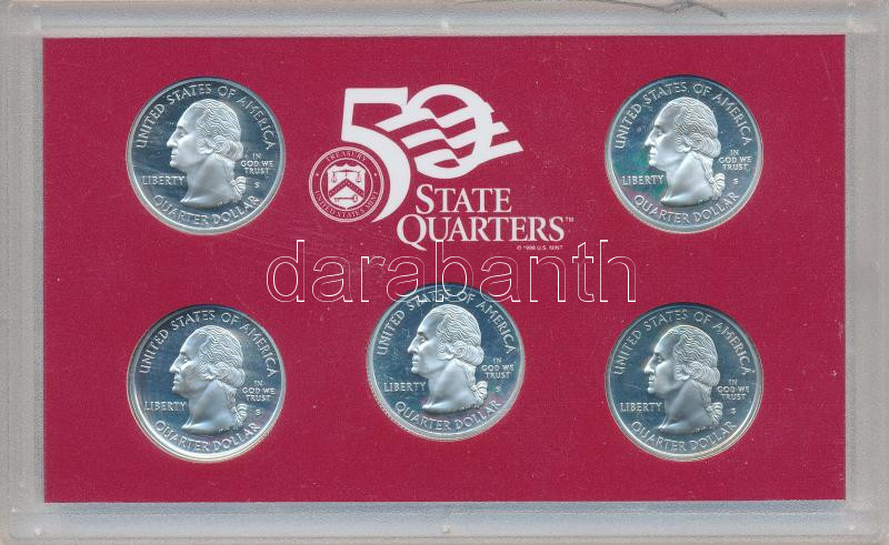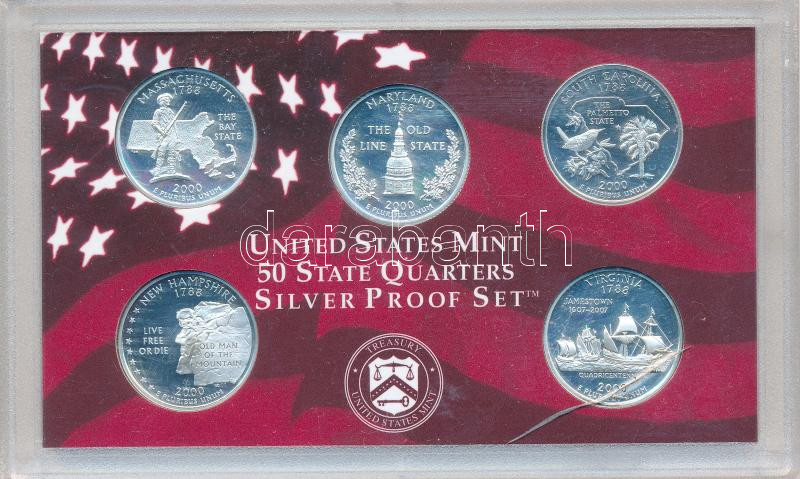 Amerikai Egyesült Államok 2000S 1/4$ Ag (5xklf) "50 állam negyed dollárosok" műanyag tokos szettben, benne: New Hampshire, Massachusetts, Maryland, South Carolina, Virginia T:PP tok repedt USA 2000S 1/4 Dollar Ag (5xdiff) "50 State Quarters" set in plastic case, with: New Hampshire, Massachusetts, Maryland, South Carolina, Virginia C:PP case cracked
