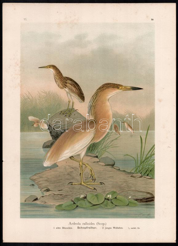 Description: 1905 Ardeola ralloides (üstökösgém), kromolitográfia, papír, In: Naumann: Naturgeschichte der Vögel Mitteleuropas (1905), egészen kis foltokkal, 39x29 cm