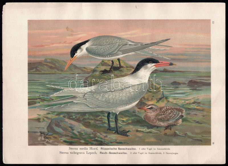 1905 Sterna media Horsf. (Bengáli csér), Sterna tschegrava Lepech. (Lócsér), kromolitográfia, papír, In: Naumann: Naturgeschichte der Vögel Mitteleuropas (1905), 29x39 cm