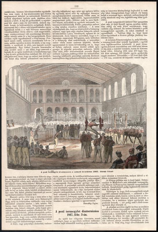 Description: Frecskay László (1844-1916): A pesti tornaegylet dísztornázása a nemzeti lovardában (1867. február 2-kán). Rotációs fametszet, papír, jelzett a metszeten, korabeli újságból kiemelve. 19x23,5 cm