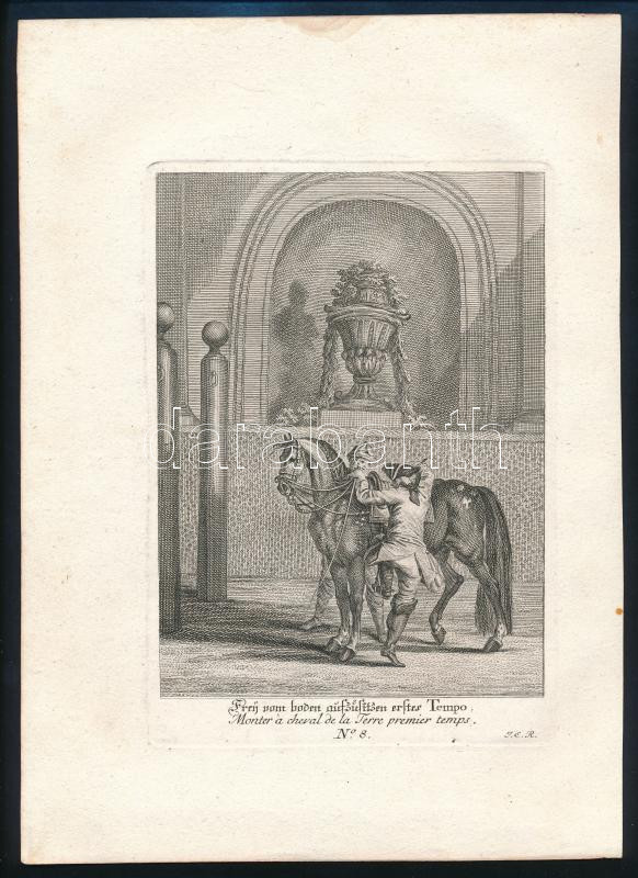Description: XVIII. század közepe Johann Elias Ridinger (1698-1767): Frey vom Boden aufzusitzen erstes Tempo. Monter á cheval de la Terre premier temps. No. 8. Rézmetszet, papír, jelzett a dúcon, lovas metszet, kis foltokkal, 20x14 cm, papír: 28x20 cm